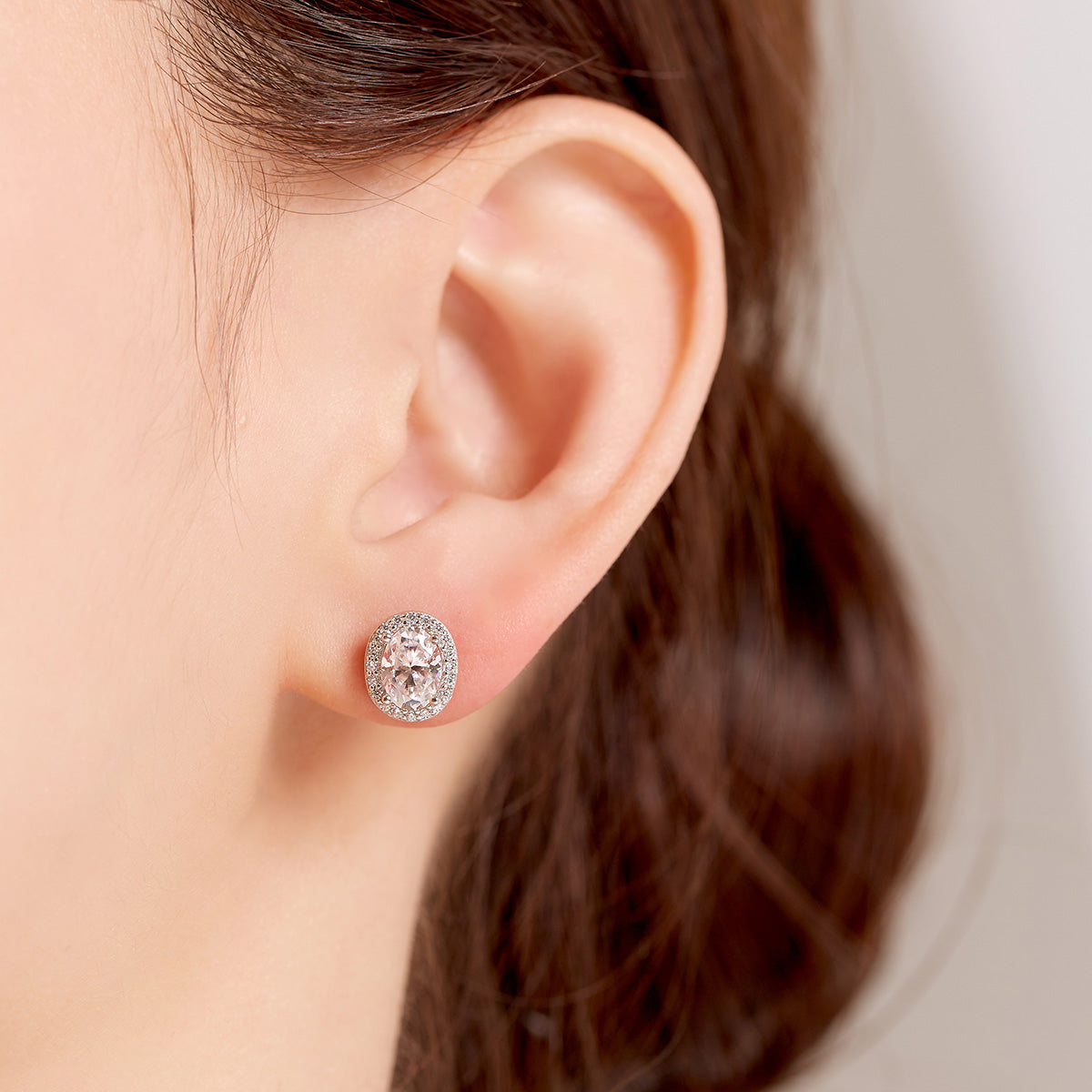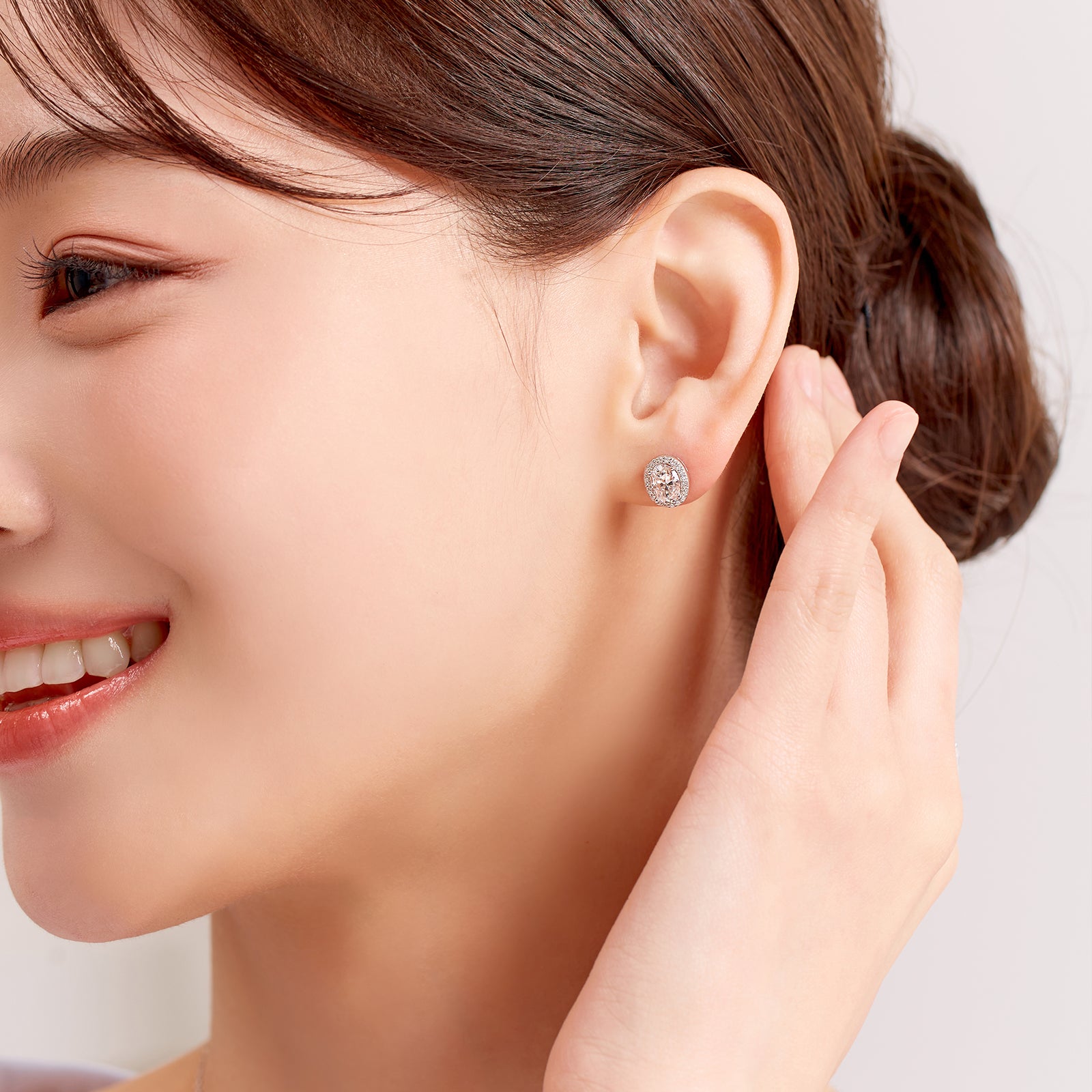 These oval-cut halo studs feature luminous moissanites framed by a delicate pavé halo, designed to enhance brilliance while subtly elongating the look on the ear. The soft curves create a flattering, elegant presence that feels both romantic and refined.